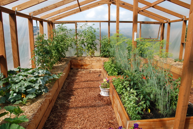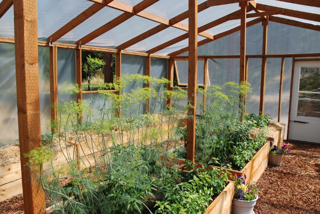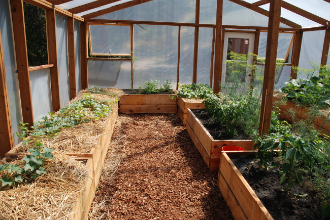 And then we can put the ground cloth down in the walking area and put the bark mulch on top of the ground cloth.  That is the last step to complete the greenhouse.