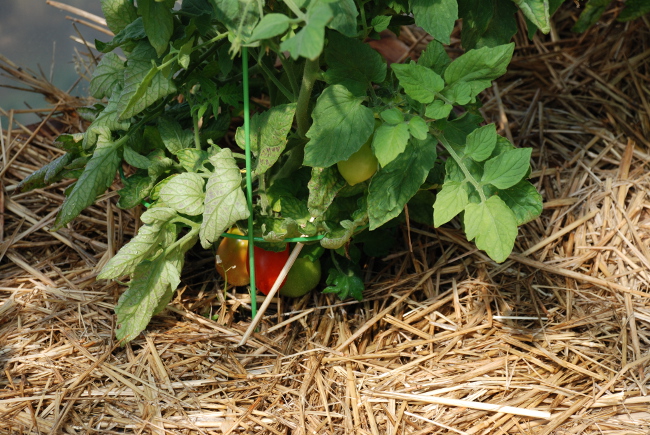 The straw we put around all the plants helps to keep moisture in the beds where the plants can use it, and has seriously cut down on the number of weeds in the greenhouse.