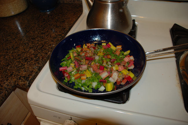 These chopped vegetables are almost ready for the next step. The swiss chard stems are so pretty, add a splash of color to the scramble, plus great vitamins and minerals.