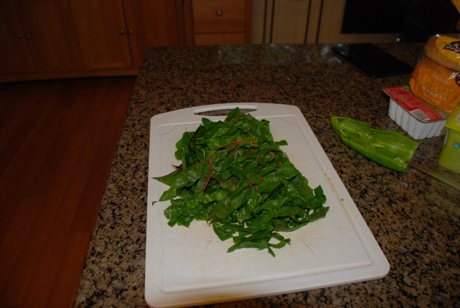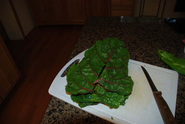 Swiss chard leaves. I have seven of them piled up, ready to be chopped into slices.