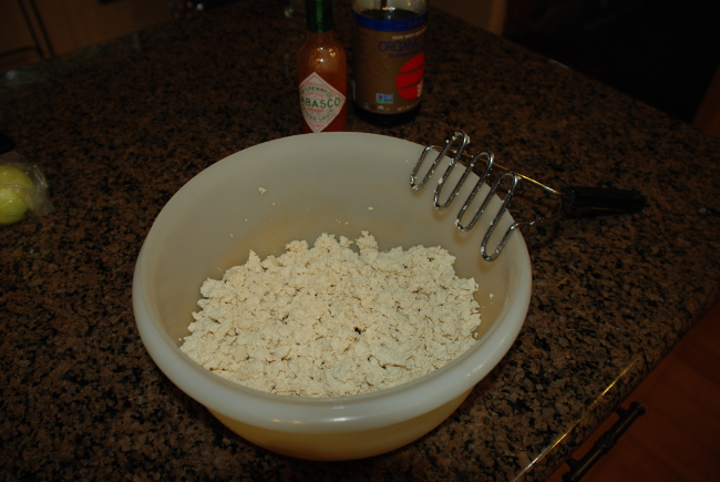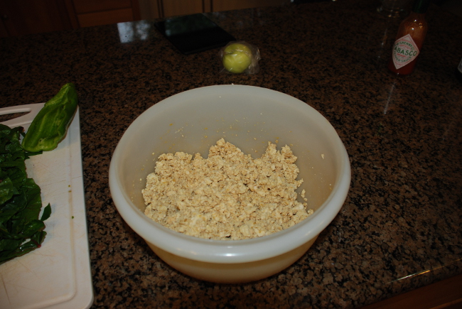 Extra firm tofu, which has been wrapped in paper towels and extra moisture removed, then crumbled up using a potato masher.