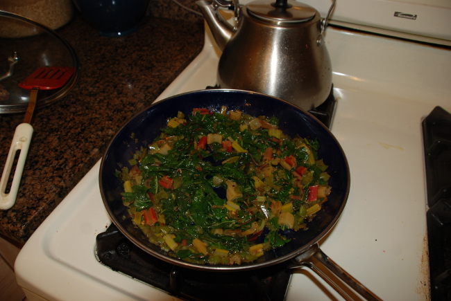 As soon as the chopped vegetables are fairly soft, I add the strips of swiss chard leaves, and pop a lid on the pan to steam the leaves.  This takes about 5-10 minutes.  Stir them around occasionally.