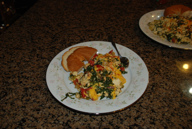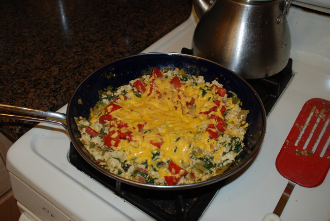 Add the tofu mixture, stir well.  Cover the pan again and cook, stirring occasionally (every few minutes), until the tofu is heated through.  This takes another ten minutes.   Then add a couple of chopped fresh tomatoes (a half cup, roughly, if the tomatoes are small), and some cheddar cheese.