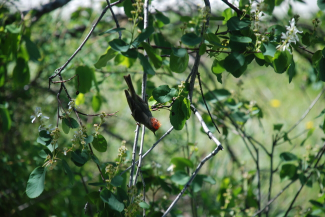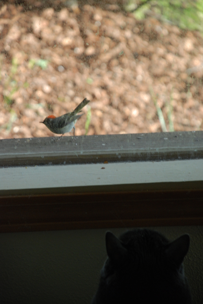 At first the Kinglet would jump when Mishkin jumped at the window, but then he figured out he was not in any danger and then he said, “Oh yeah!! Tough guy. Bring it on.” Bounce bounce bounce. This went on for hours the first day, until finally Mishkin was lying flat out on the floor under the window, complaining about there ain’t no justice. The next day, Mish wouldn’t even go to the window, just yelled at the bird. And today, not even bothering to yell.